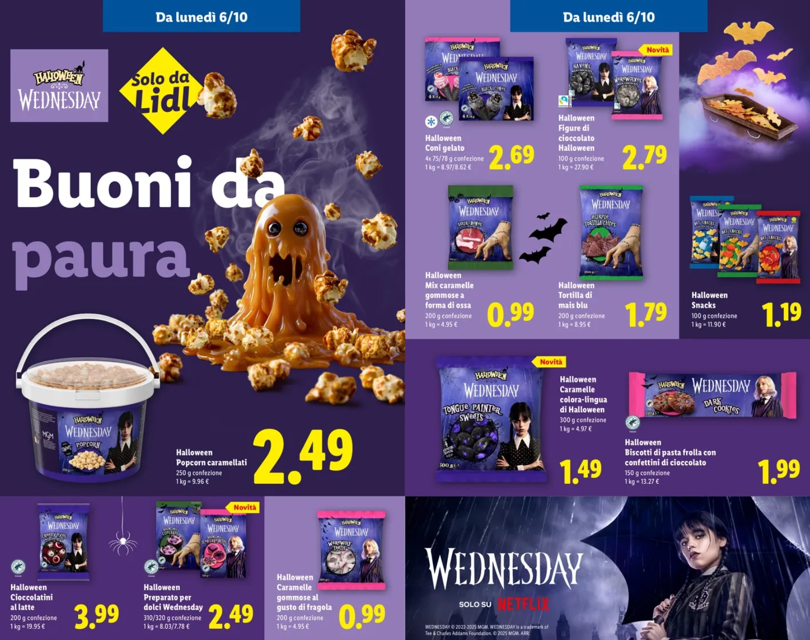 L’autunno è ufficialmente iniziato e con ottobre tornano le atmosfere magiche e spettrali di Halloween. Quest’anno però Lidl alza l’asticella e trasforma i suoi scaffali in un piccolo set cinematografico: nasce la linea Halloween Wednesday, una collezione tematica dedicata alla più iconica delle eroine dark, Mercoledì Addams. Dalle caramelle gommose ai biscotti al cacao con crema lilla, dai marshmallow ai set decorativi per la casa, l’esperienza d’acquisto diventa una vera festa a tinte gotiche — rigorosamente a prezzi mini.